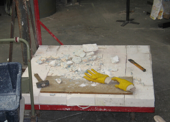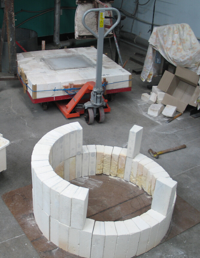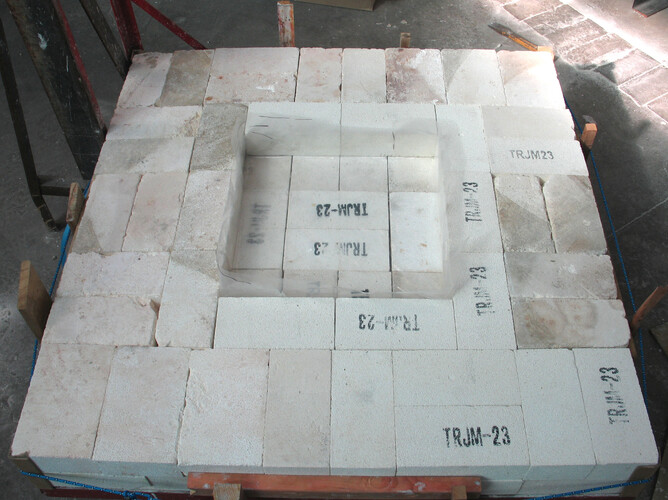 Demolition complete, rubbish disposed of and have started the re-build. Re-laid the fibre and bricks that make up the base and decided to cast a square in the middle to prevent the fibre underneath being squashed like the last time. Now cutting the bricks that make the surround for the crucible