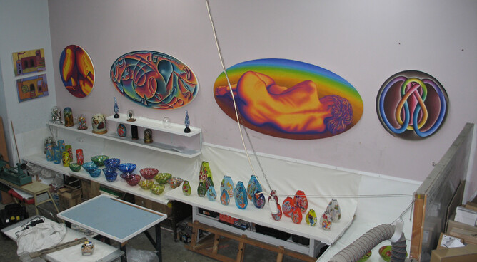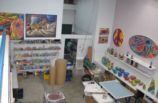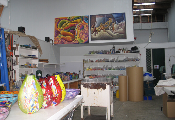 I have finally managed to hang some paintings in the studio. Some have been unwrapped for the first time since we moved six years ago. This move was inspired by a possibility that may come to pass soon. If it does I will let you know. Meanwhile someone is coming to buy a painting next week. The person contacted me the same day that I hung these ones, which I think is auspicious, although the purchase has been planned for a year or so :-) I hope to be able to start painting on canvas again soon. I am getting a lot more done on glass and accumulating a series based on Mussorgsky's Pictures at an Exhibition. I would love to be able to paint these on canvas. I might put a few more paintings up in the blowing studio next week.