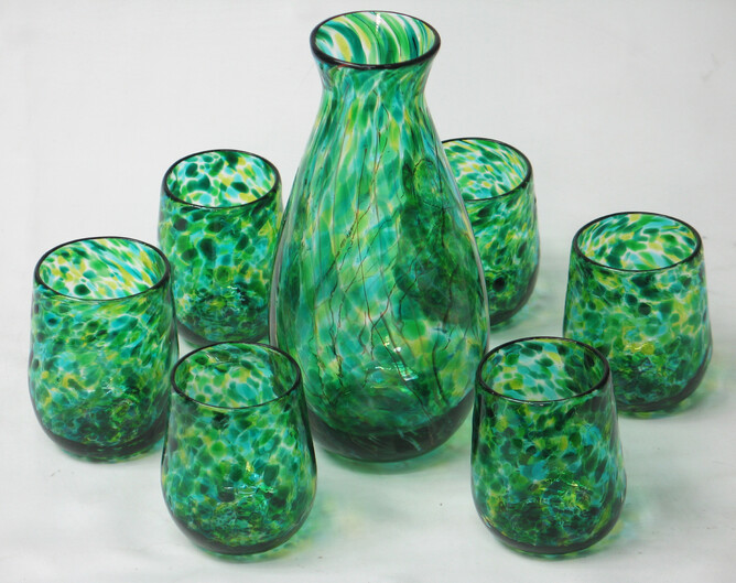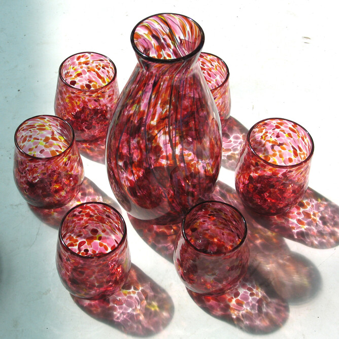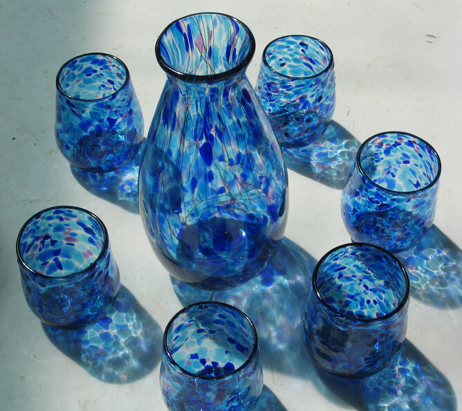 I thought I should show you my new tumblers made with K2 transparent frits and the carafes I made to go with them. As well as green, blue and red I have tried them in yellow but have not got the colours right yet.