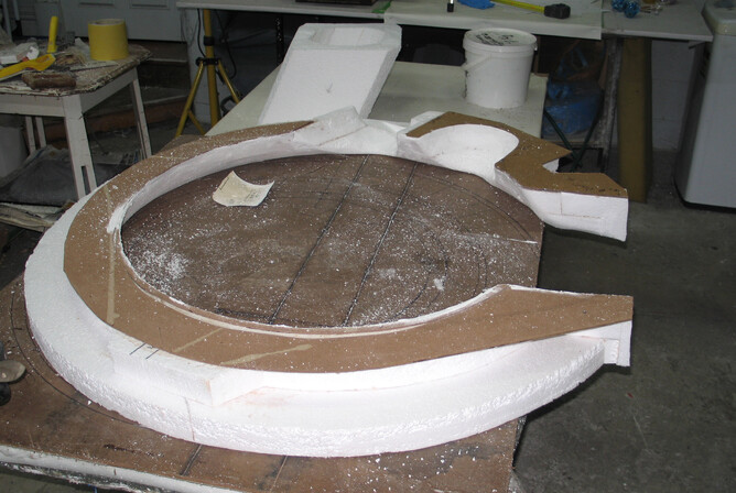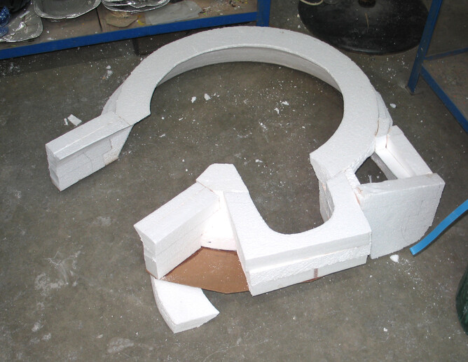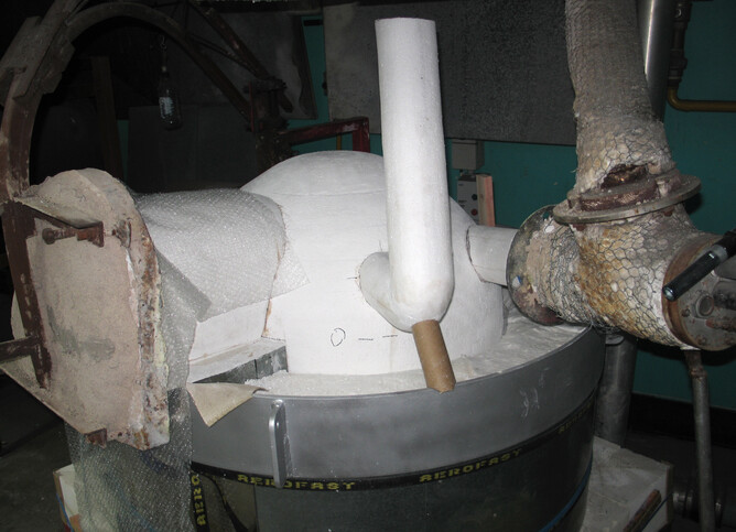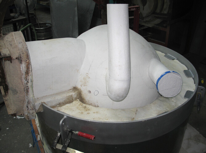 Yesterday Justin and Rebecca helped me to cast the first layer of the top of the furnace - an 80mm layer of 1800 refractory cast in a former made of polystyrene. Making the former took me a week but the result was effective, especially joining the lower and upper parts together with hardboard and screws. This was much quicker to fit than the last time I made a furnace which should mean the dome holds together better. The big change with this furnace is the steel ring that should allow me to lift the top off in a few years when I need to replace the crucible. That will save lots of money and time.