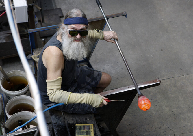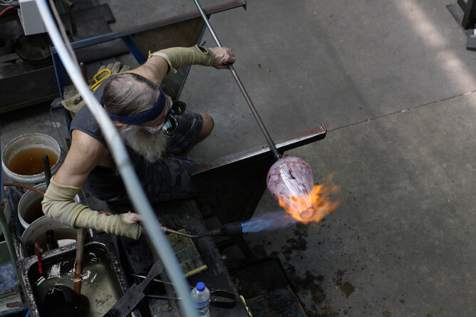 Photographer Dave Kerr was in the studio a few days ago and sent me a couple of the images he took of me blowing. In the top photo I was reducing the black lustre. The reducing flame turns silver oxide into pure silver on the surface of the glass to create a shiny lip-wrap. In the photo below I was cooling the next piece ready for the last gather of clear glass over the coloured core.