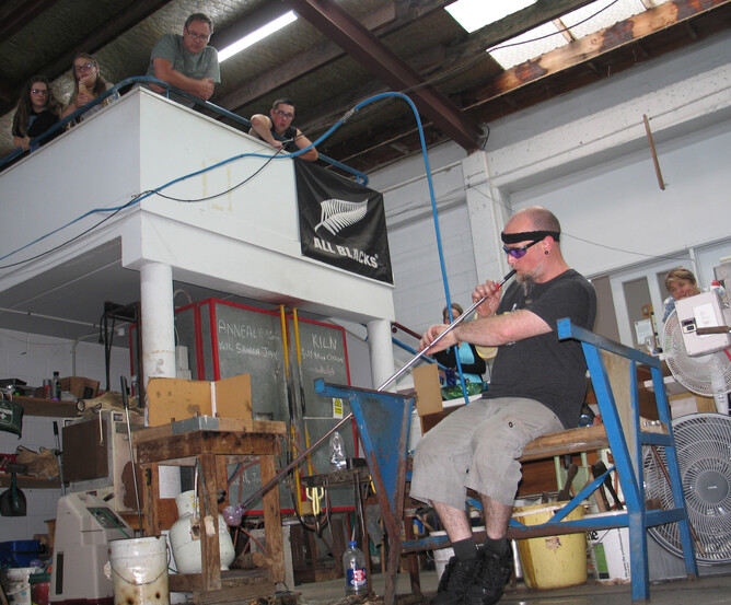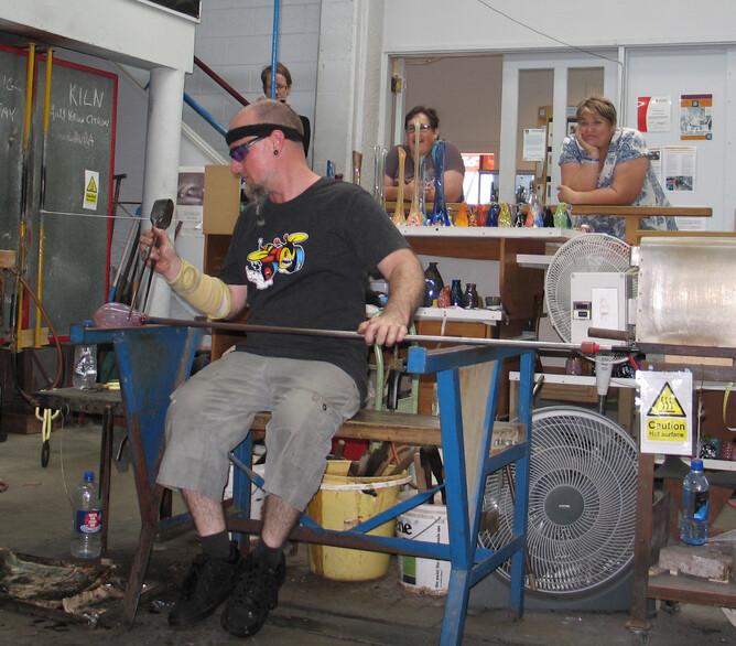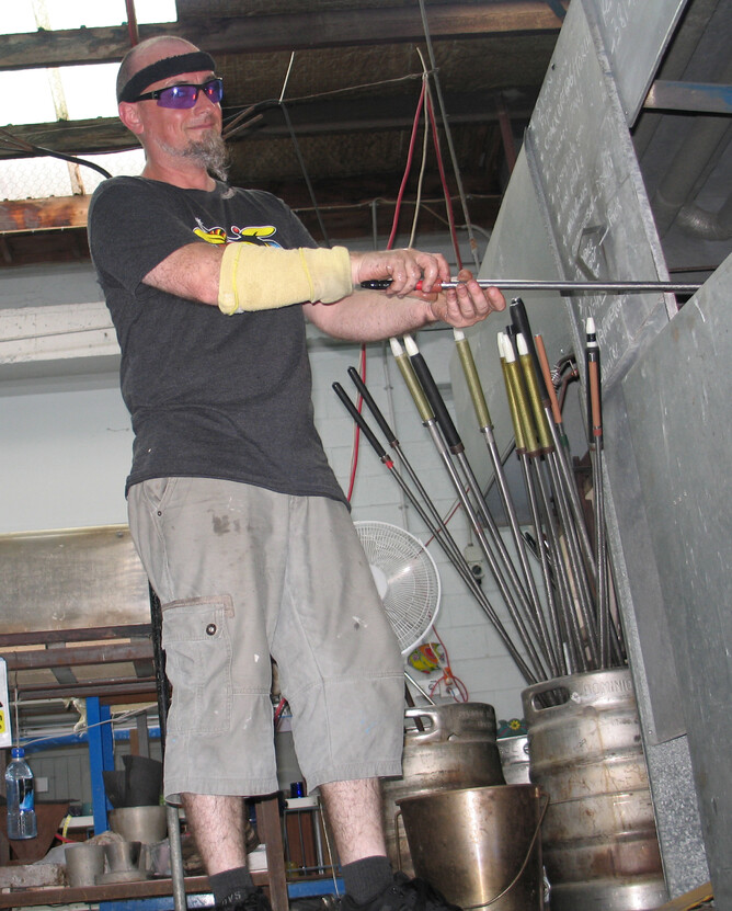 Here's a few photos of my new assistant, Brendon, at work in my studio today. This is his second day at work. He is looking forward to making his work with the excellent Swedish glass I use, once he has got settled in. He is finding it a bit hotter than Whanganui, where he has been a valued assistant and glass blower since I was a student with him in 2004. As well as his experience with glass blowing and assisting he has great skills with cold working (grinding and polishing) glass. I rang him in August, to ask about a technical issue to do with making glass and ended up offering him a job up here in Whangarei. After six and a half years, mostly working solo, I thought it about time I got more help. Shawn has been helping over the last year, when our calendars coincide and he will continue to be a valued assistant. He will be working with Brendon on Wednesday for the first time.