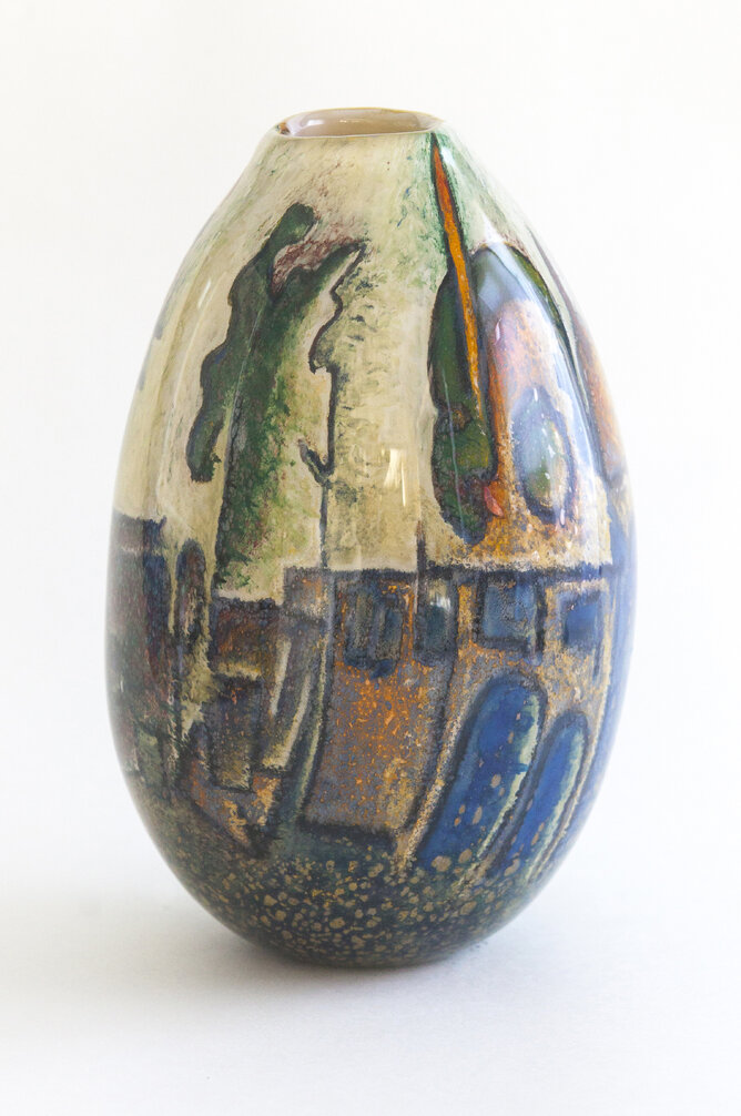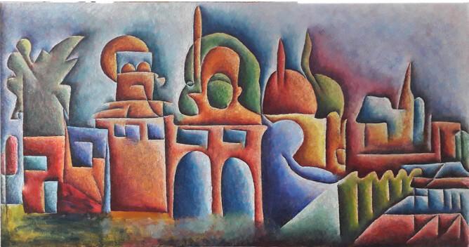 We are getting a lot of rain again and so I have been able to do a bit of painting on canvas for a change. Here are the Great Gates of Kiev on a new canvas. Quite a bit more work to do but this shows the general idea. I hope to paint a few more of the Mussorgsky series on canvas. Below is the original watercolour sketch, the underpainting (complementary colours) and the same work on glass.